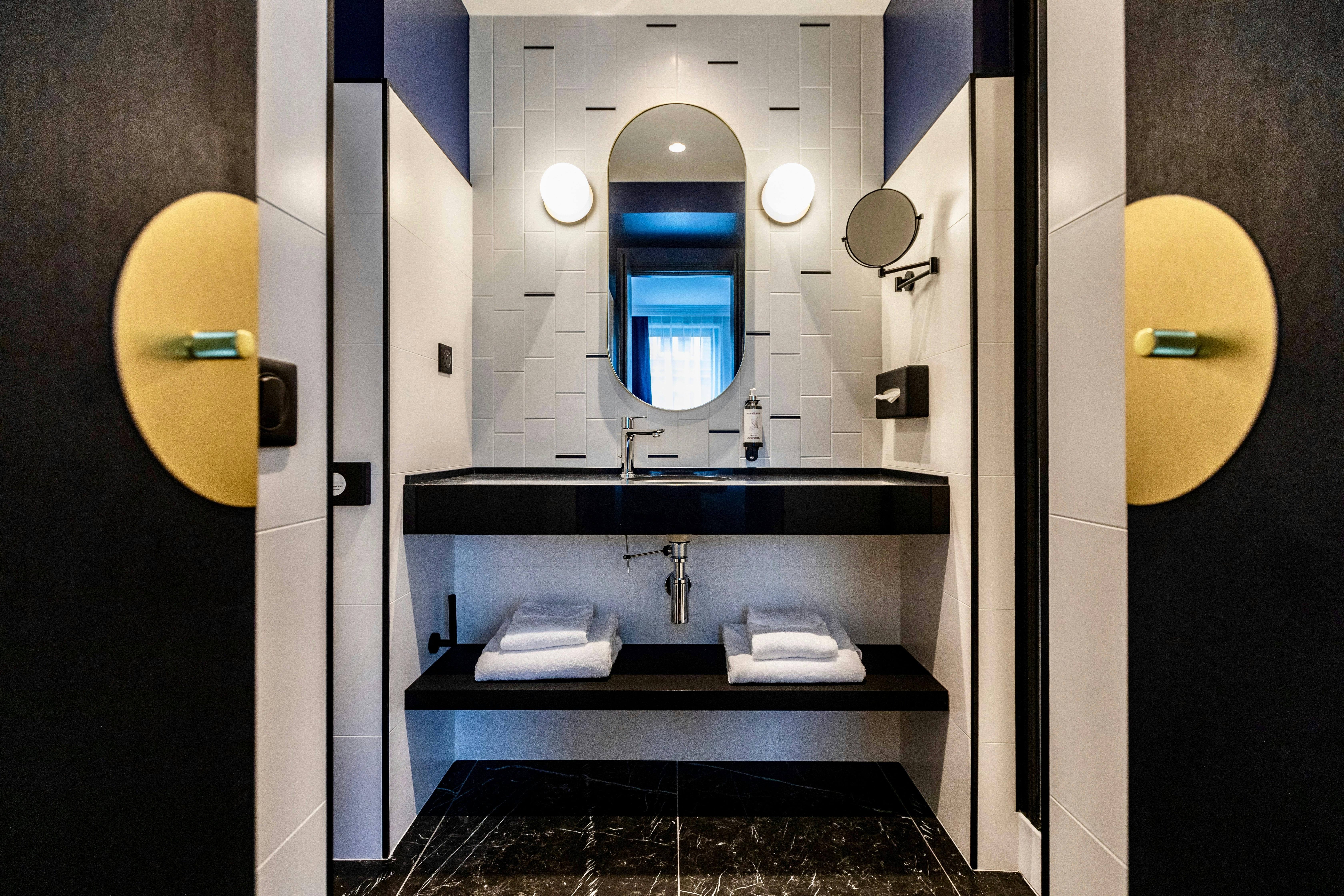 Salle de bain privative : douche, lavabo, sèche-cheveux, WC, produits de toilettes supplémentaires.